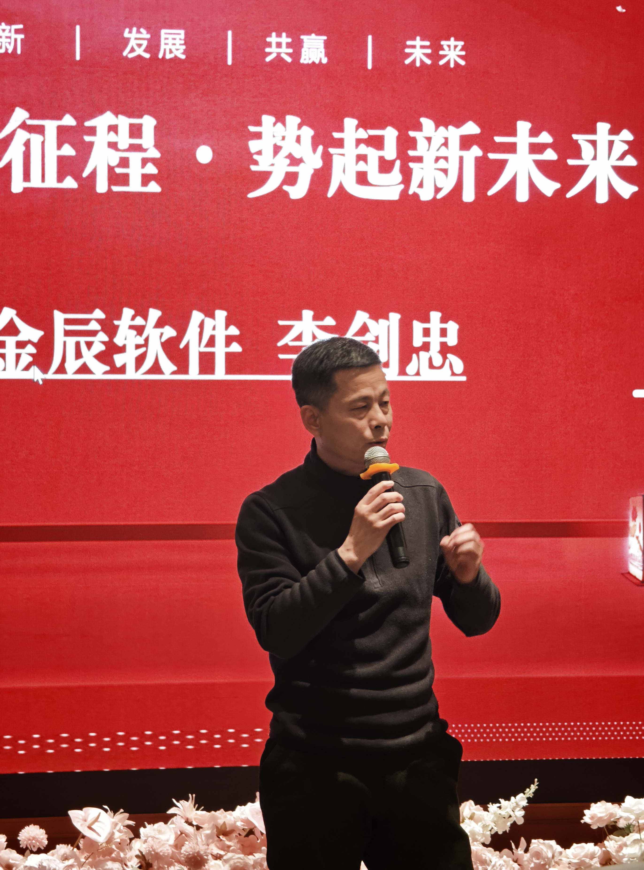 視頻過后,倪總登臺為年會致辭,既對公司 2025 年的發(fā)展成果進行了全面總結(jié),肯定了全體員工的辛勤付出與不懈堅守,也為 2026 年的發(fā)展擘畫了美好藍圖,提出了新的期許與要求。隨后,李劍忠李總發(fā)表致辭,樸實的話語中滿是對團隊的認可與關(guān)懷,為全體金辰人新一年的奮斗指明了方向。兩位領(lǐng)導(dǎo)的致辭振奮人心、催人奮進,讓現(xiàn)場員工深受鼓舞,陣陣熱烈的掌聲在會場久久回蕩。