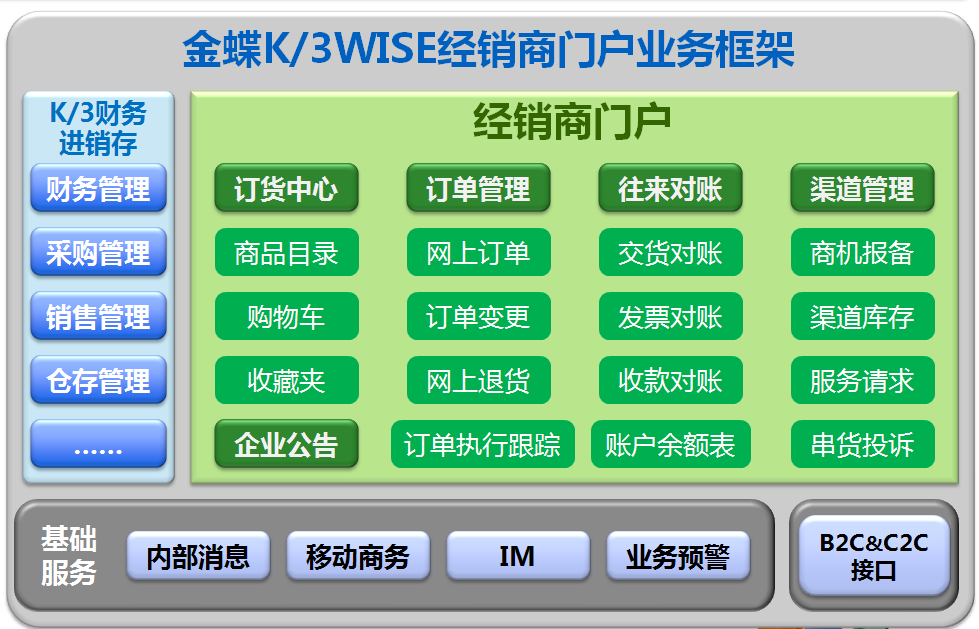 經(jīng)銷商管理系統(tǒng)主要以K/3WISE經(jīng)銷商門戶模塊為主,介紹經(jīng)銷商如何通過(guò)經(jīng)銷商門戶進(jìn)行溝通、訂貨、退貨、對(duì)賬等,形成金蝶K/3WISE經(jīng)銷商門戶解決方案。