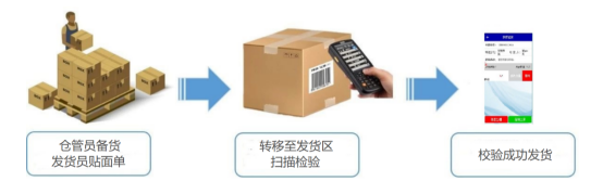 條碼與管易電商系統(tǒng)完美結(jié)合,電商部門發(fā)貨人員在倉庫揀貨時,將面單黏貼在成品上,將成品拉到發(fā)貨區(qū)域,發(fā)貨員手持PDA檢驗面單與實際貨物信息,揀貨合格才允許發(fā)貨,減少了發(fā)錯貨的概率,同時也減少了與快遞公司丟件的扯皮事件。